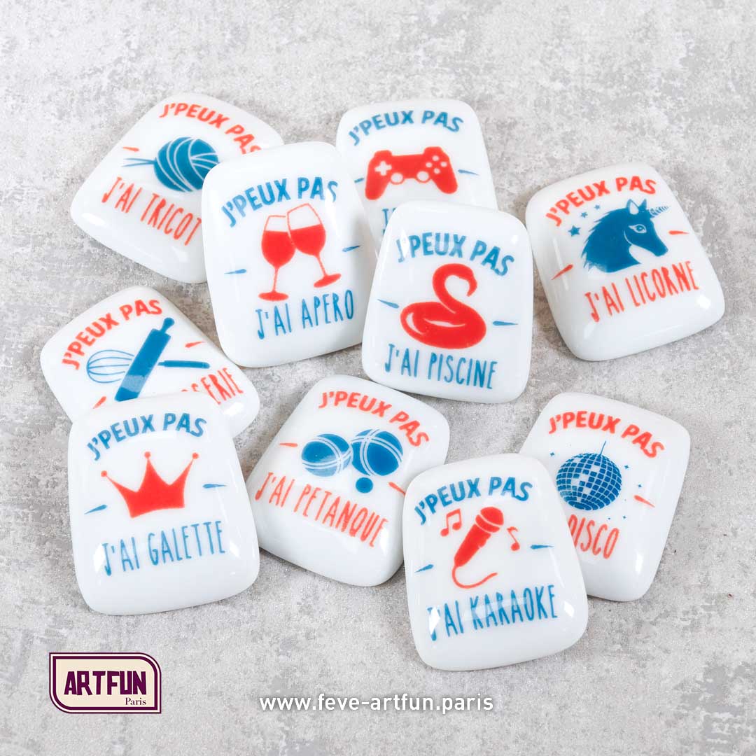Cette année, égayez l'Épiphanie avec une touche d'humour qui plaira à tous. Retrouvez la réplique culte "J'Peux Pas" revisitée par ArtFun. Cette collection de fèves se prête à encourager la créativité de vos convives et à vous amuser à trouver les fausses excuses les plus insolites. Les Fèves ArtFun en porcelaine véritable sont conçues avec un décor coloré délicatement posé à la main, et une forme bombée qui préserve votre pâte feuilletée, en limitant aussi les risques pour les enfants en cas d’ingestion. Des fèves qui se démarquent, aussitôt propres et brillantes, qui feront la joie des fans de blagues et bonnes réparties.